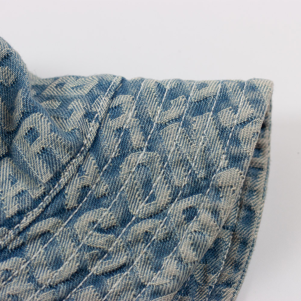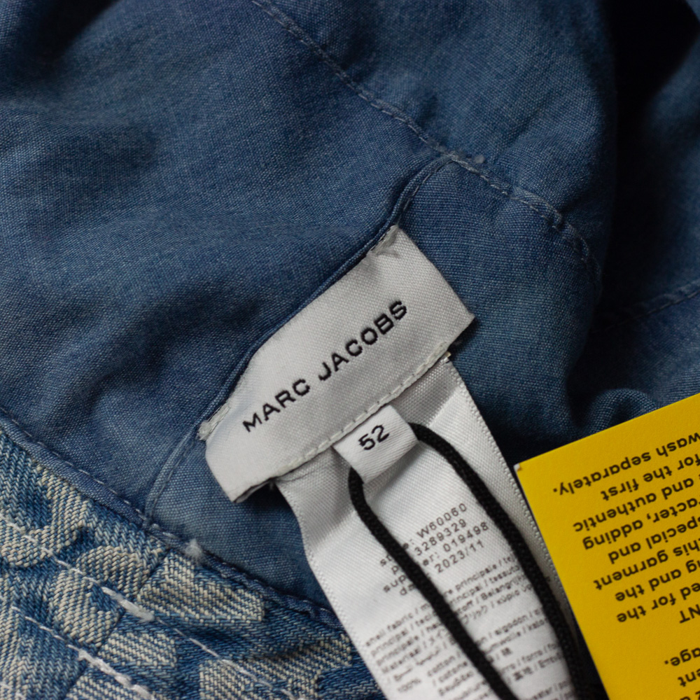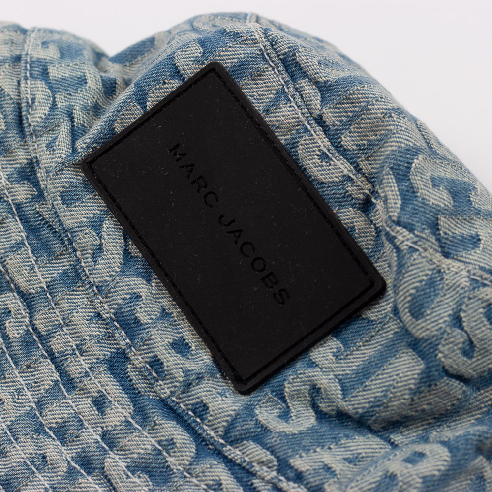 Marc Jacobs Sonnenhut in blauem Denim Look mit Logo Schrift und Applikation, Herstellergröße: 52.